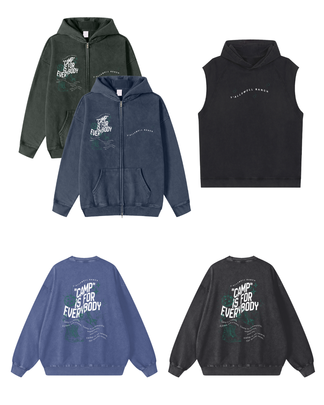 Where comfort meets community. This limited collection of vintage-washed hoodies, crewnecks, and sleeveless pullovers celebrates the dual meaning of “camp” — from queer culture’s love of expression to the nostalgic spirit of summer adventures.